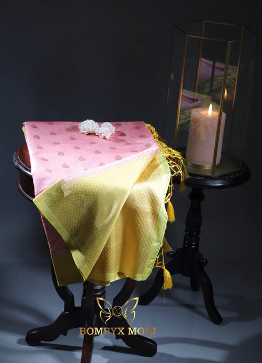 Carnation Pink and Bright Yellow Bombyx Banarasi Saree