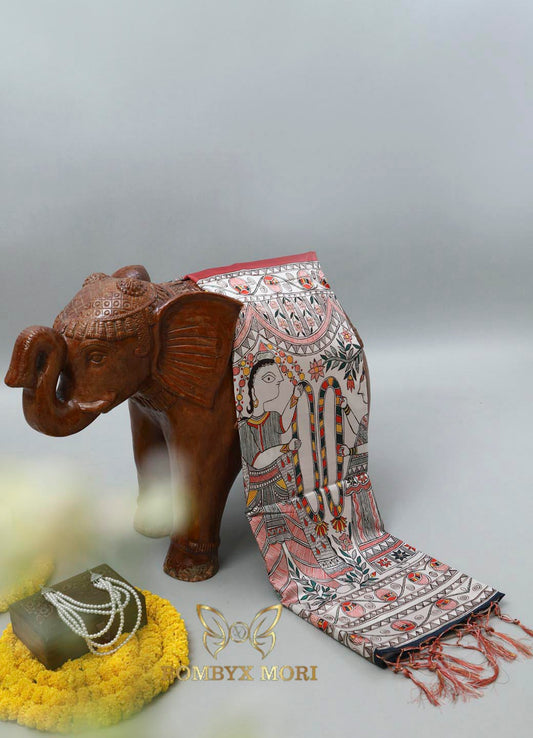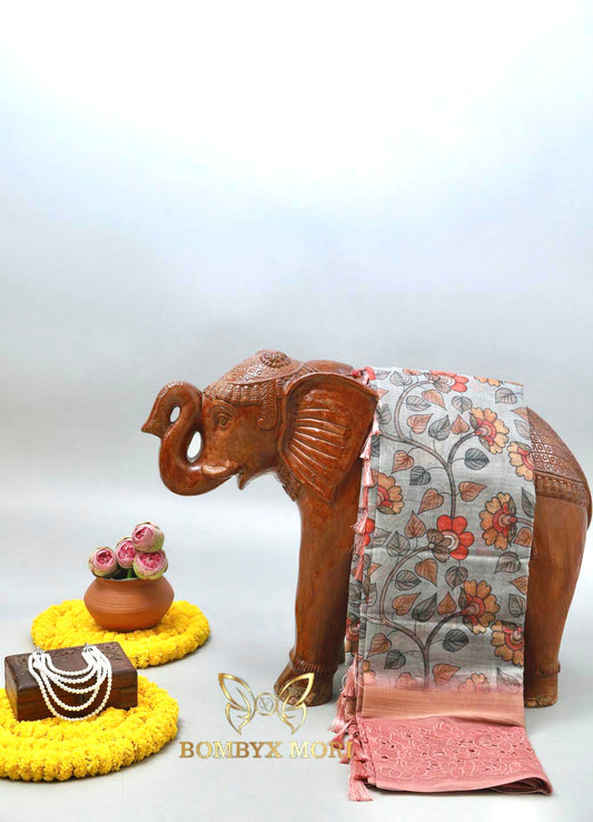 Cloud Grey & Rouge Pink floral Madhubani saree