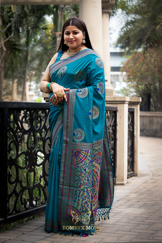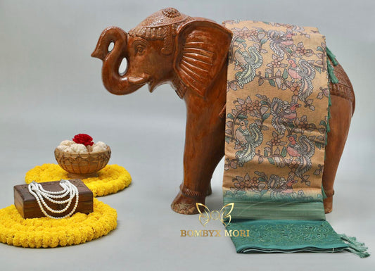 Pastel Yellow & Rough Green Floral Madhubani Saree