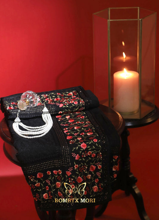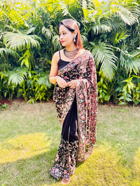 Midnight Enchanting Flamingo Leaf Saree